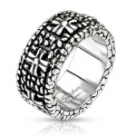 La partie centrale de la croix offre un magnifique contraste entre le poli brillant de l'acier et les zones ombrées noircies, accentuant la tridimensionnalité de la bague. Chaque branche du symbole est ornée de motifs découpés avec finesse, constitués de courbes et contre-courbes dynamiques, renforçant l'impression de mouvement et de complexité. L'anneau, avec une largeur significative de 30mm, possède une surface lisse et éclatante, dotée d'un aspect audacieux prononcé.