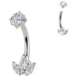 Piercing nombril avec une tige arquée réalisé dans un acier de haute qualité maintenue par deux embouts sertis de zircons clairs ou roses, au choix.