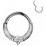 Ce piercing septum aux finitions soignées est ciselé d'un cordage ponctué par un superbe médaillon en opale synthétique.